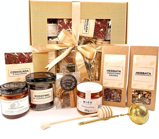 KOSZ PREZENTOWY HERBATY CZEKOLADKI MIÓD DUŻY BOX na święta z herbatą zestaw