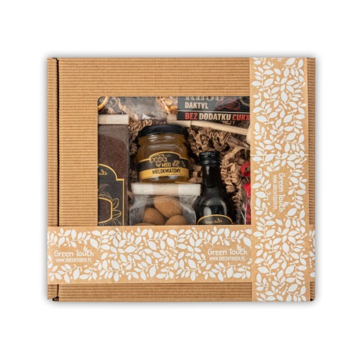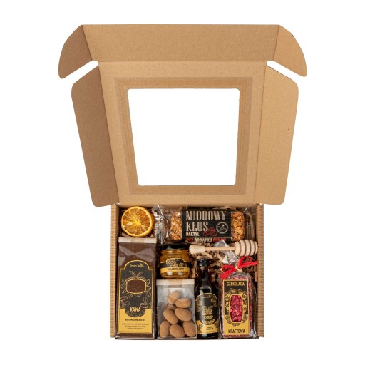 Box zestaw prezentowy prezent kawa miód syrop czekolada baton migdały kraft